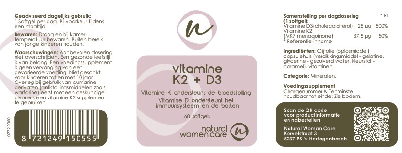 Vitamine K2 en D3 werken synergetisch samen voor cardiovasculaire gezondheid. K2 helpt calcium naar de botten te dirigeren en weg te houden uit de bloedvaten, wat belangrijk is voor het voorkomen van vasculaire verkalking. Vitamine D3 ondersteunt de normale bloeddrukregulatie en heeft ontstekingsremmende eigenschappen.