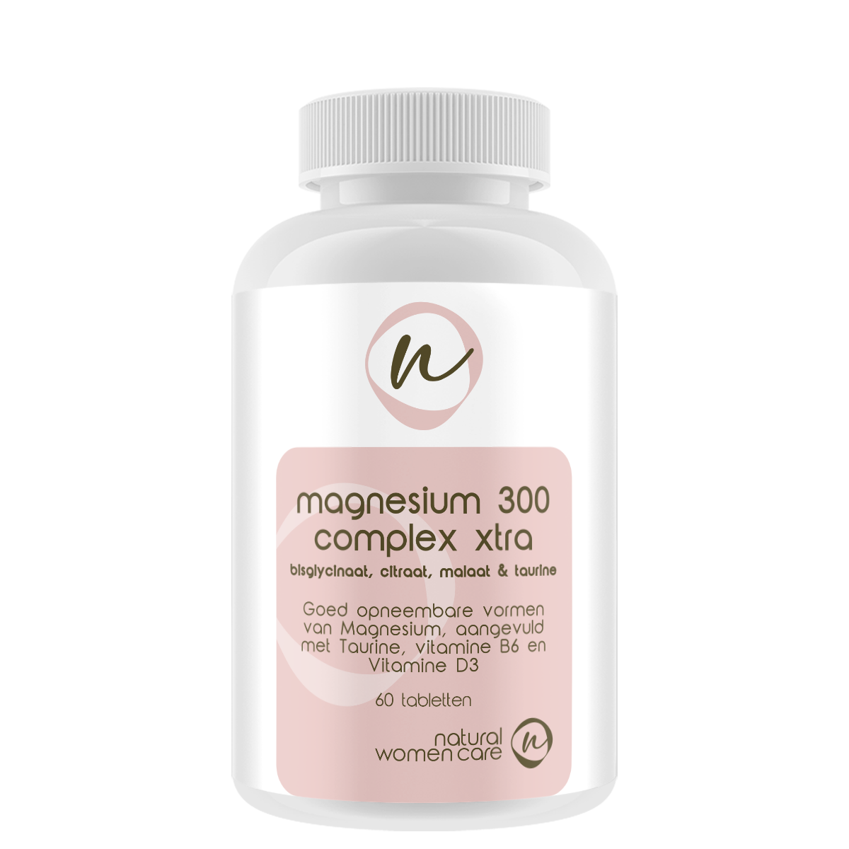 Magnesium 300 Complex Xtra: het mineraal met zoveel functies! Ook rondom PMS! Bij vrouwen hieraan lijden is de magnesiumconcentratie in de rode bloedcel (erytrocyten) vaak lager dan normaal. Aanvullen dus! Magnesium ondersteunt honderden reacties in je lichaam en draagt bij aan een betere slaap (wat weer goed is voor je hormonen). Deze magnesium is een mix van 3 soorten goed opneembare magnesium (Malaat, Bisglycinaat en Citraat), aangevuld met Vitamine B6, Taurine en Vitamine D3.